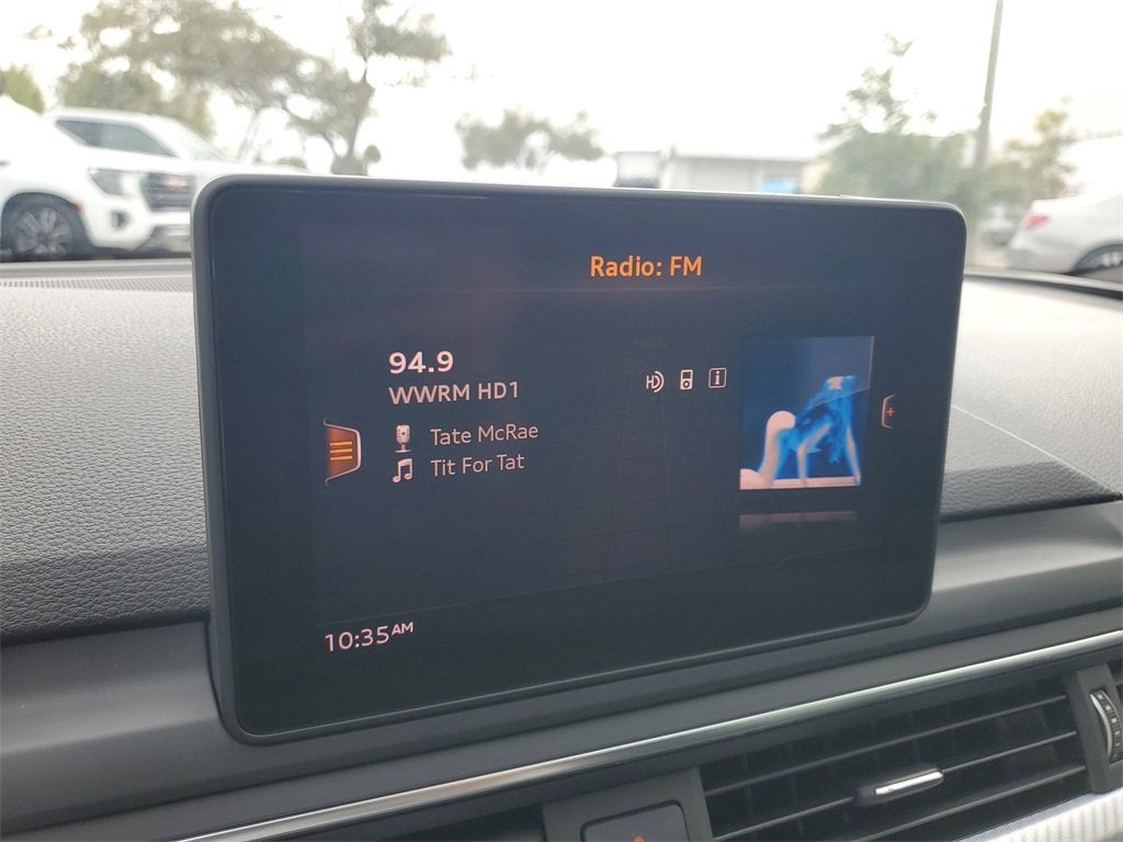 10 Speakers, 4-Wheel Disc Brakes, ABS brakes, Air Conditioning, AM/FM radio, Automatic temperature control, Brake assist, Delay-off headlights, Electronic Stability Control, Four wheel independent suspension, Front Bucket Seats, Front dual zone A/C, Leather steering wheel, Occupant sensing airbag, Panic alarm, Power adjustable front head restraints, Power driver seat, Radio data system, Radio: Audi Sound System, Remote keyless entry, Speed-sensing steering, Tachometer, Telescoping steering wheel, Alloy wheels, Anti-whiplash front head restraints, Audi smartphone interface (Apple CarPlay/Android Auto), Auto-dimming Rear-View mirror, Bumpers: body-color, Compass, Driver door bin, Driver vanity mirror, Dual front impact airbags, Dual front side impact airbags, Exterior Parking Camera Rear, Front anti-roll bar, Front Center Armrest, Front fog lights, Front reading lights, Garage door transmitter: HomeLink, Heated door mirrors, High intensity discharge headlights: Bi-xenon, Illuminated entry, Knee airbag, Leather Seating Surfaces, Leather Shift Knob, Outside temperature display, Overhead airbag, Overhead console, Passenger door bin, Passenger vanity mirror, Power door mirrors, Power Liftgate, Power moonroof, Power passenger seat, Power steering, Power windows, Rain sensing wipers, Rear air conditioning, Rear anti-roll bar, Rear reading lights, Rear seat center armrest, Rear window defroster, Speed control, Speed-Sensitive Wipers, Split folding rear seat, Steering wheel mounted audio controls, Tilt steering wheel, Traction control, Trip computer, Turn signal indicator mirrors, Variably intermittent wipers, and Wheels: 18 x 8.5 10-Spoke-Dynamic-DesigN.