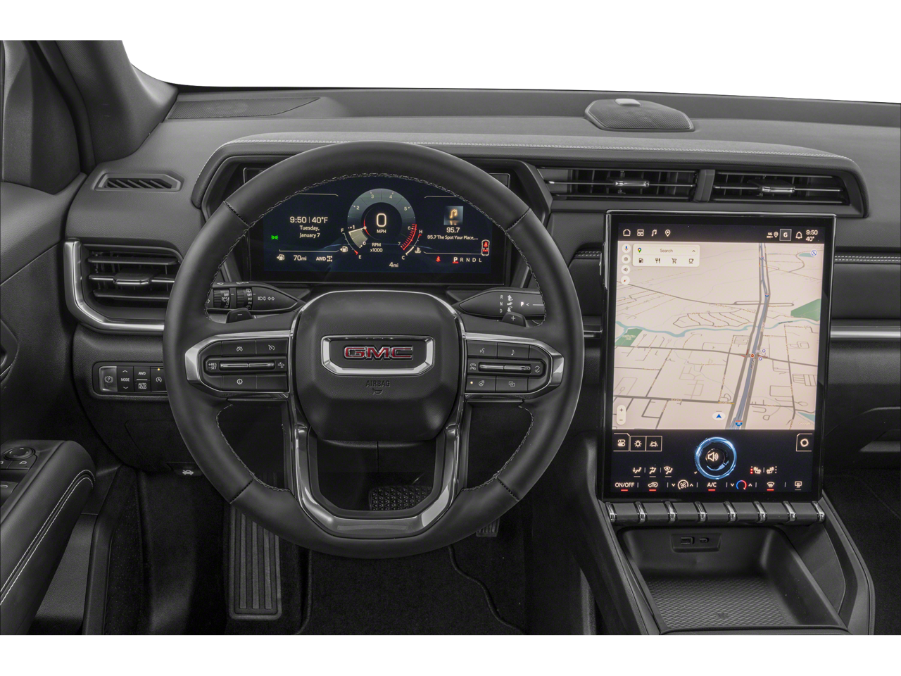 Preferred Equipment Group 5SB, 2-Way Power Driver Lumbar Seat Adjuster, 3.47 Final Drive Axle Ratio, 4-Wheel Disc Brakes, 6 Speakers, 6-Speaker Audio System Feature, 8-Way Power Driver Seat Adjuster, ABS brakes, Air Conditioning, Alloy wheels, AM/FM radio: SiriusXM, Auto High-beam Headlights, Automatic temperature control, Brake assist, Bumpers: body-color, Compass, Delay-off headlights, Driver & Front Passenger Heated Seats, Driver door bin, Driver vanity mirror, Dual front impact airbags, Dual front side impact airbags, Electronic Stability Control, Emergency communication system: OnStar and GMC connected services capable, Four wheel independent suspension, Front anti-roll bar, Front Bucket Seats, Front Center Armrest, Front dual zone A/C, Front fog lights, Front reading lights, Fully automatic headlights, Garage door transmitter, Heated door mirrors, Heated front seats, Heated rear seats, Heated steering wheel, Illuminated entry, Low tire pressure warning, Memory seat, Navigation System, Occupant sensing airbag, Outside temperature display, Overhead airbag, Overhead console, Panic alarm, Passenger door bin, Passenger vanity mirror, Perforated Leather-Appointed Seat Trim, Power door mirrors, Power driver seat, Power Liftgate, Power passenger seat, Power steering, Power windows, Radio data system, Radio: Premium GMC Infotainment System, Rain sensing wipers, Rear air conditioning, Rear anti-roll bar, Rear seat center armrest, Rear window defroster, Rear window wiper, Remote keyless entry, Security system, SiriusXM w/360L Trial Subscription, Speed control, Speed-sensing steering, Split folding rear seat, Spoiler, Sport steering wheel, Steering wheel mounted audio controls, Tachometer, Telescoping steering wheel, Tilt steering wheel, Traction control, Trip computer, Variably intermittent wipers, Ventilated Driver Seat, Ventilated Front Passenger Seat, Ventilated front seats, Wheels: 19 x 7.5 Midnight Silver Aluminum, and Wireless Apple CarPlay/Wireless Android AutO.